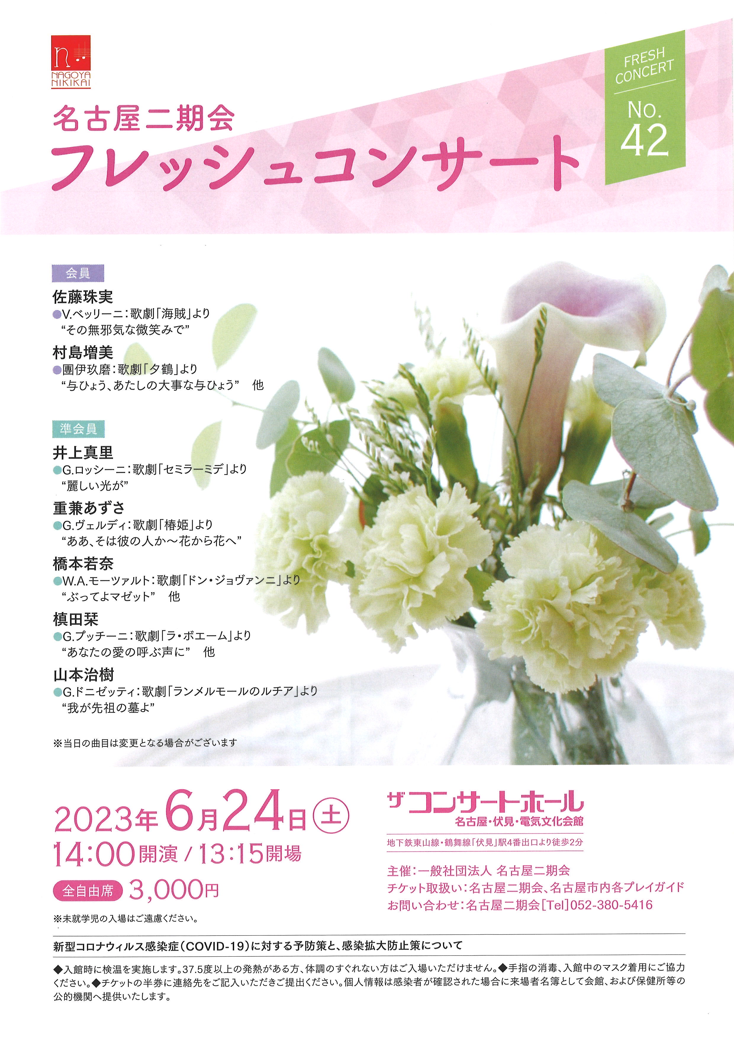 トップページ イベントスケジュール 名古屋二期会 フレッシュコンサート 名古屋二期会 フレッシュコンサート 催事内容はこちらをご覧ください 施設名 ザ・コンサートホール 開催日 2023年6月24日(土) 時間 14:00 料金 ¥3,000 お問い合わせ 一般社団法人名古屋二期会(052)380-5416 電気文化会館では、チケットのお取り扱いをしておりません。有料チケットご購入の際は、主催者さまに直接お尋ねください。