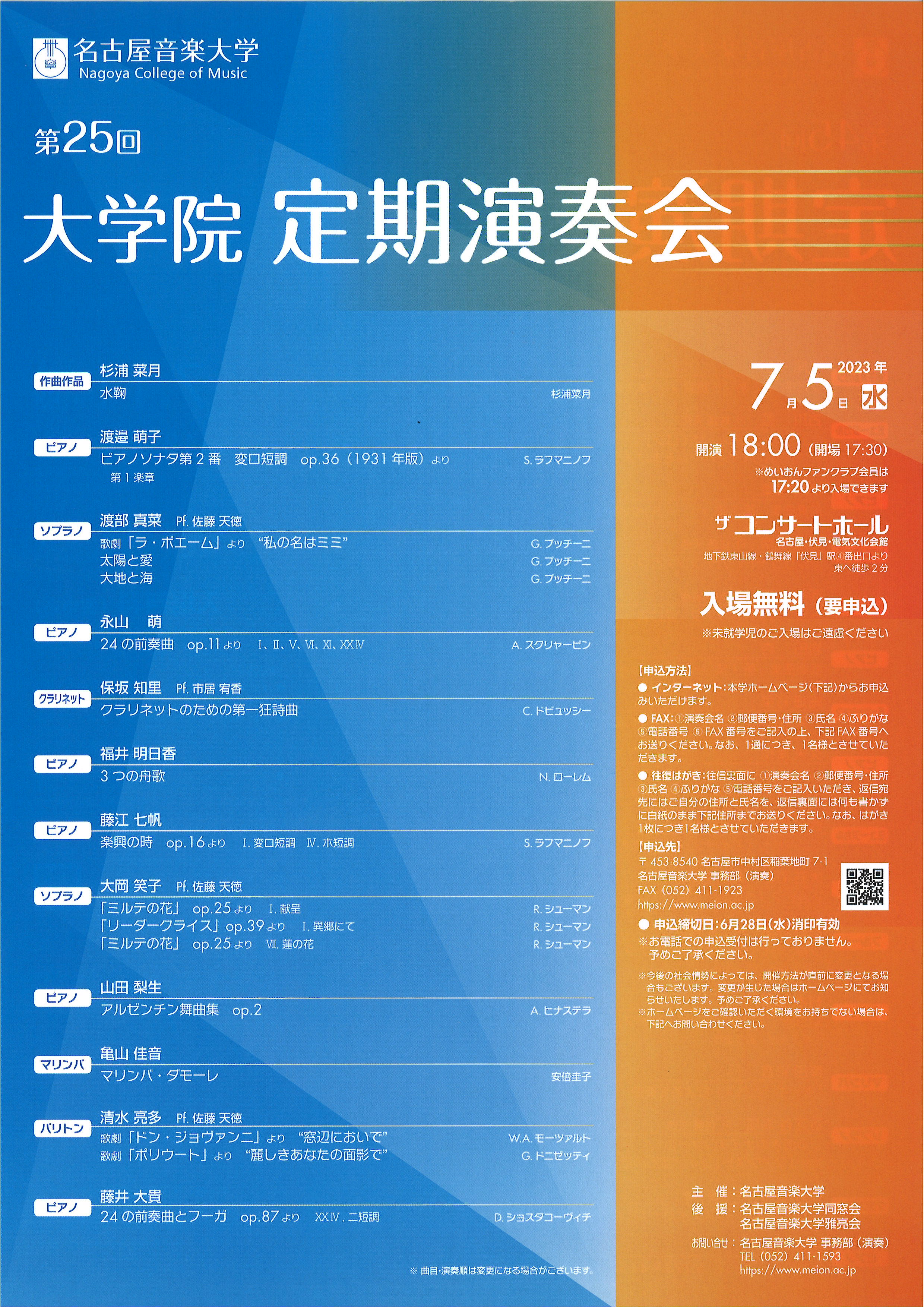 トップページ イベントスケジュール 名古屋音楽大学 第25回大学院定期演奏会 名古屋音楽大学 第25回大学院定期演奏会 催事内容はこちらをご覧ください 施設名 ザ・コンサートホール 開催日 2023年7月5日(水) 時間 18:00 料金 要申込 お問い合わせ 名古屋音楽大学 事務部(演奏)(052)411-1593 電気文化会館では、チケットのお取り扱いをしておりません。有料チケットご購入の際は、主催者さまに直接お尋ねください。