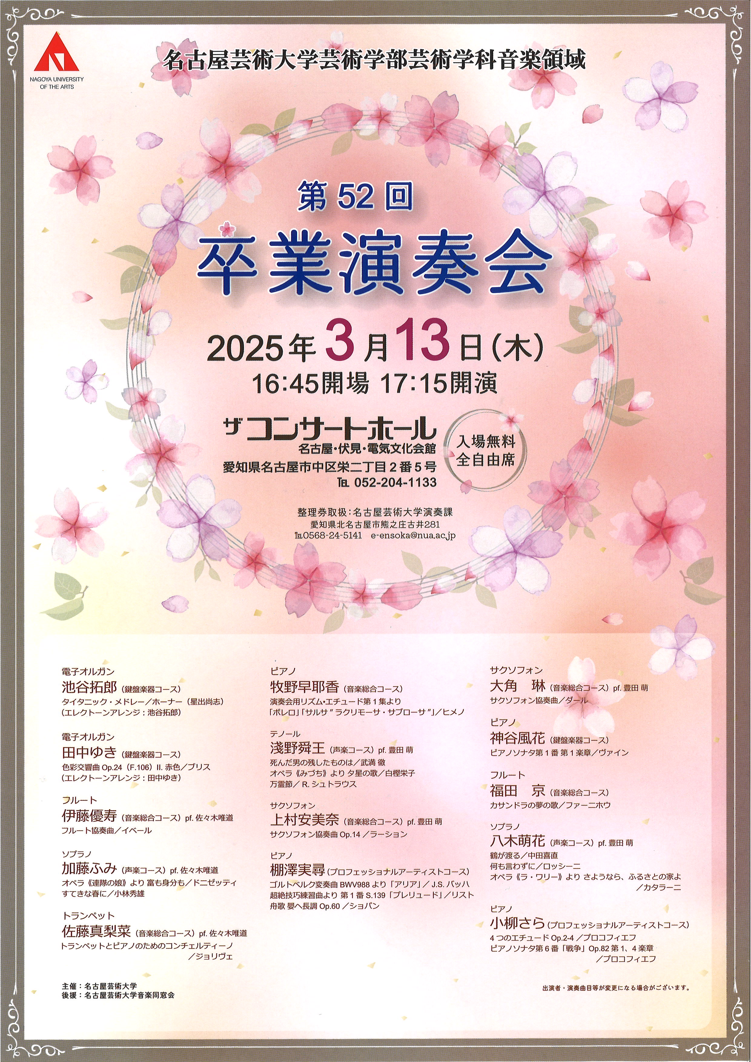 トップページ イベントスケジュール 名古屋芸術大学 第52回卒業演奏会 名古屋芸術大学 第52回卒業演奏会 催事内容はこちらをご覧ください 施設名 ザ・コンサートホール 開催日 2025年3月13日(木) 時間 17:15 料金 無料 お問い合わせ 名古屋芸術大学 演奏課(0568)24-5141 電気文化会館では、チケットのお取り扱いをしておりません。有料チケットご購入の際は、主催者さまに直接お尋ねください。