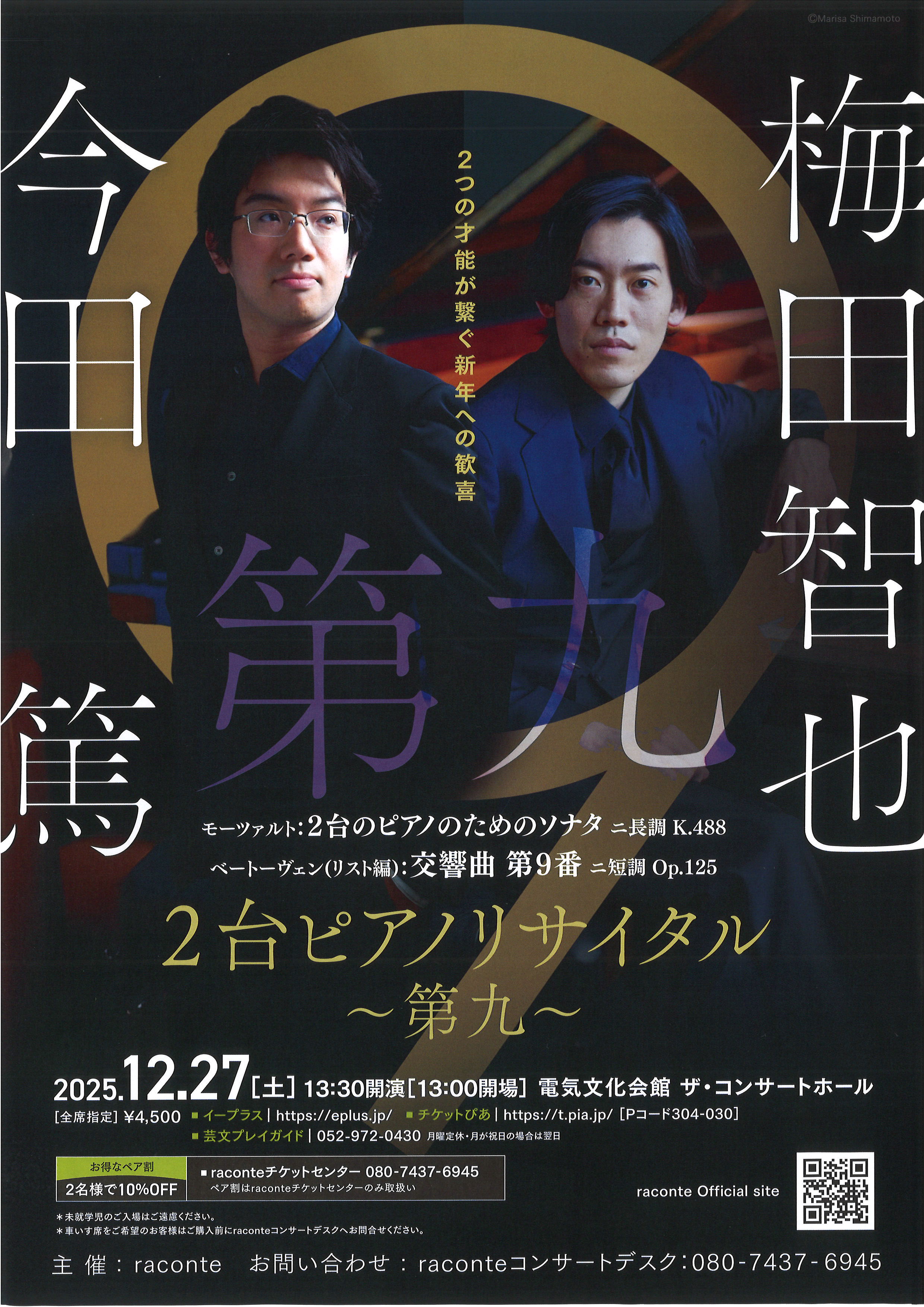 トップページ イベントスケジュール 梅田智也&今田 篤 2台ピアノリサイタル ~第九~ 梅田智也&今田 篤 2台ピアノリサイタル ~第九~ 催事内容はこちらをご覧ください 施設名 ザ・コンサートホール 開催日 2025年12月27日(土) 時間 13:30 料金 【全席指定】¥4,500 お得なペア割 2名様で10%OFF お問い合わせ raconteコンサートデスク 080-7437-6945 電気文化会館では、チケットのお取り扱いをしておりません。有料チケットご購入の際は、主催者さまに直接お尋ねください。