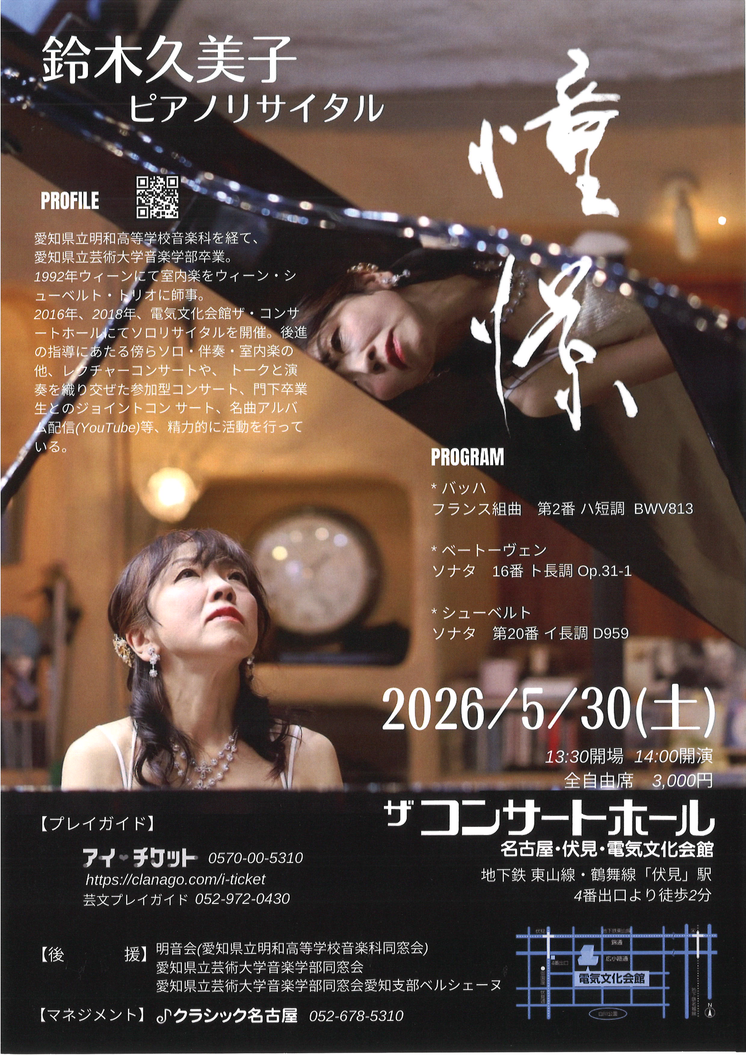 トップページ イベントスケジュール 鈴木久美子 ピアノリサイタル ~憧憬~ 鈴木久美子 ピアノリサイタル ~憧憬~ 催事内容はこちらをご覧ください 施設名 ザ・コンサートホール 開催日 2026年5月30日(土) 時間 14:00 料金 ¥3,000 お問い合わせ クラシック名古屋 052₋678₋5310 電気文化会館では、チケットのお取り扱いをしておりません。有料チケットご購入の際は、主催者さまに直接お尋ねください。