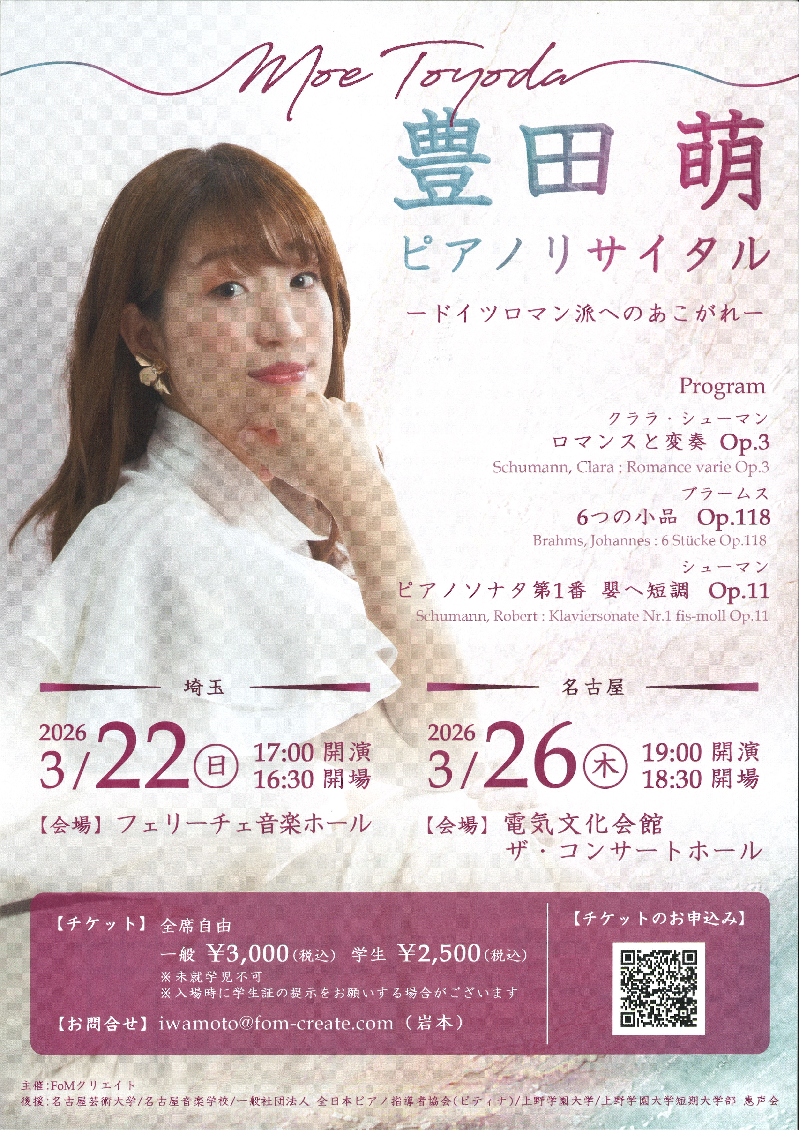 トップページ イベントスケジュール 豊田 萌ピアノリサイタル~ドイツロマン派へのあこがれ~ 豊田 萌ピアノリサイタル~ドイツロマン派へのあこがれ~ 催事内容はこちらをご覧ください 施設名 ザ・コンサートホール 開催日 2026年3月26日(木) 時間 19:00 料金 【全席自由】一般¥3,000 学生¥2,500 お問い合わせ FoMクリエイト iwamoto@fom-create.com 電気文化会館では、チケットのお取り扱いをしておりません。有料チケットご購入の際は、主催者さまに直接お尋ねください。