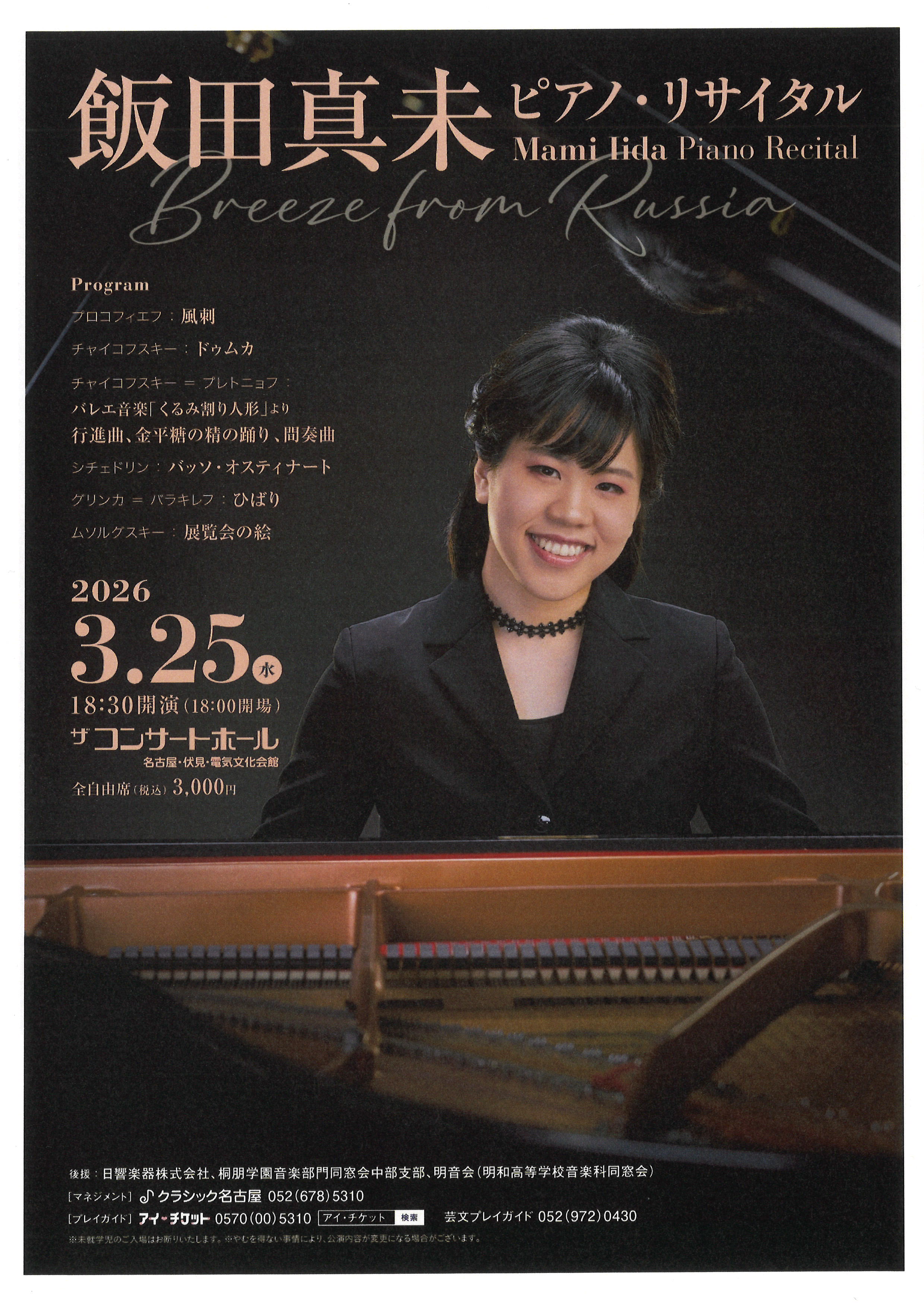 トップページ イベントスケジュール 飯田真未 ピアノ・リサイタル 飯田真未 ピアノ・リサイタル 催事内容はこちらをご覧ください 施設名 ザ・コンサートホール 開催日 2026年3月25日(水) 時間 18:30 料金 ¥3,000 お問い合わせ クラシック名古屋 052-678-5310 電気文化会館では、チケットのお取り扱いをしておりません。有料チケットご購入の際は、主催者さまに直接お尋ねください。