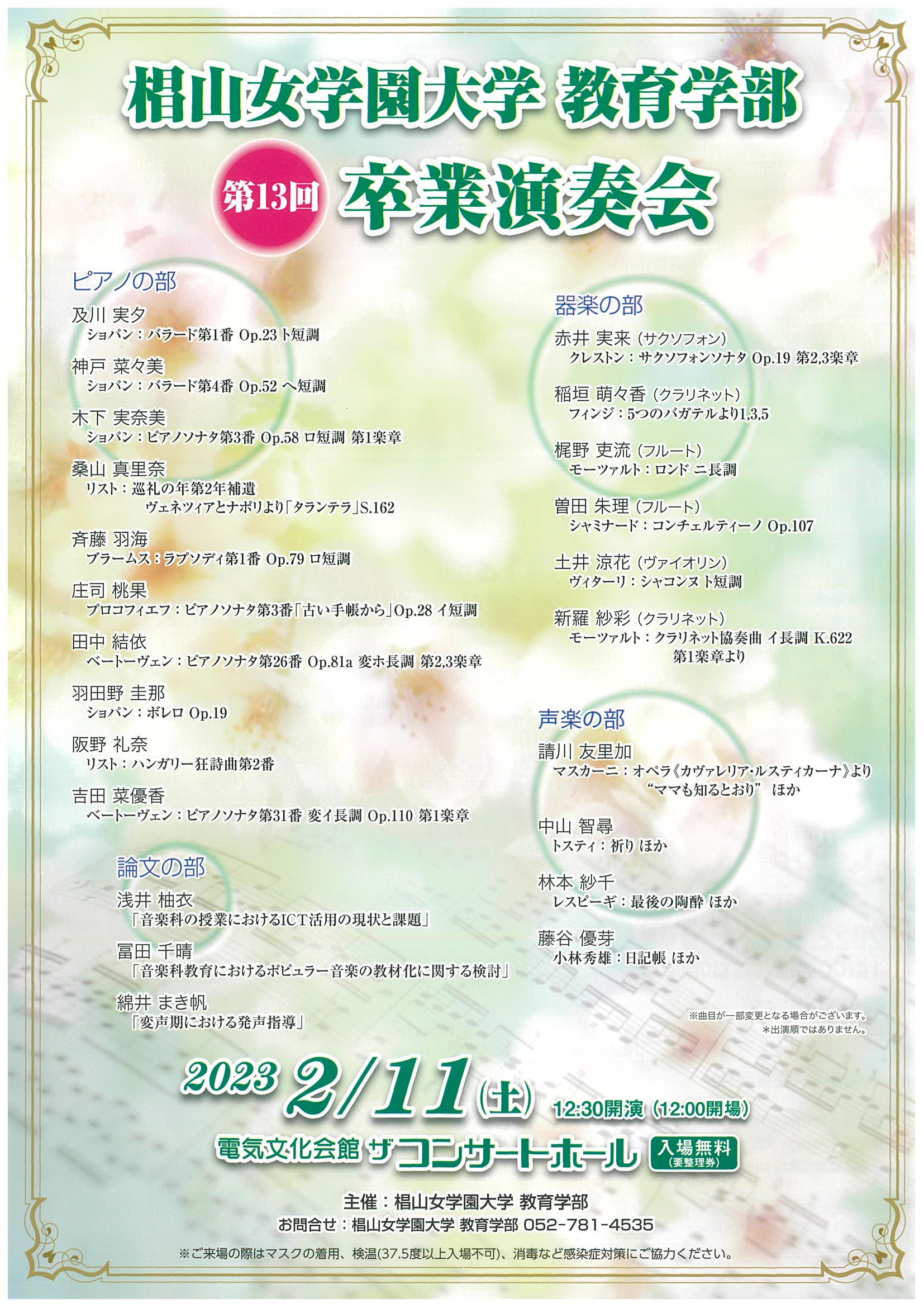トップページ イベントスケジュール 椙山女学園大学 教育学部 第13回卒業演奏会 椙山女学園大学 教育学部 第13回卒業演奏会 催事内容はこちらをご覧ください 施設名 ザ・コンサートホール 開催日 2023年2月11日(土) 時間 12:30 料金 無料(要整理券) お問い合わせ 椙山女学園大学 教育学部(052)781-4535 電気文化会館では、チケットのお取り扱いをしておりません。有料チケットご購入の際は、主催者さまに直接お尋ねください。
